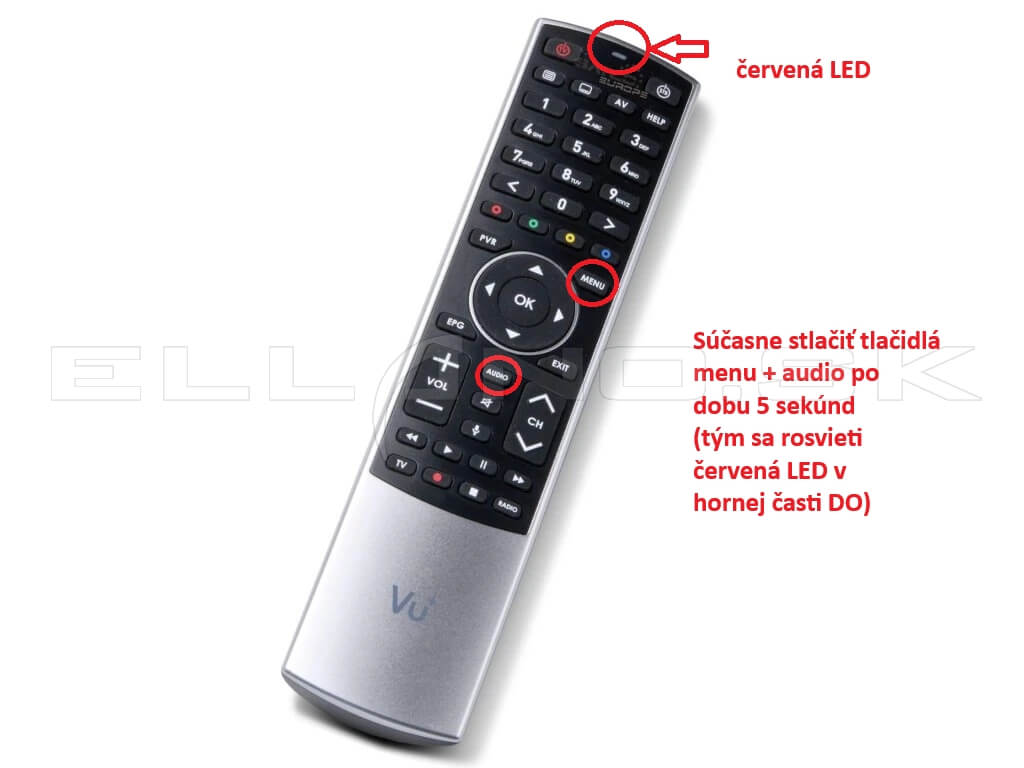 Na diaľkovom ovládači stlačte a držte približne 5 sekúnd kombináciu MENU + AUDIO, kým sa nerozsvieti červená LED.