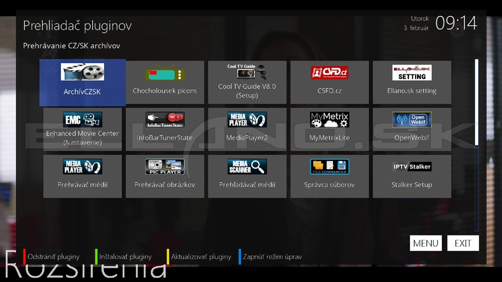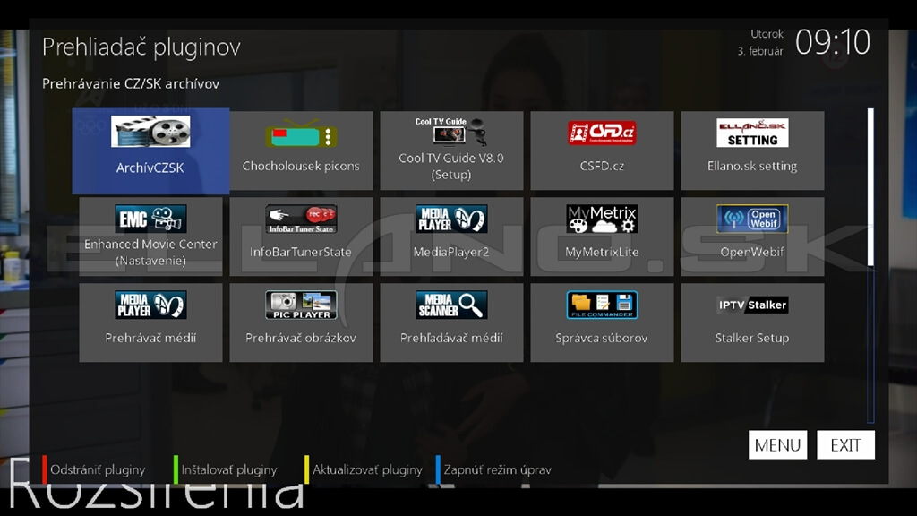 Vojdite do Menu - Prehliadač pluginov a stlačte zelené tlačidlo (pre stiahnutie/inštaláciu doplnkov zo servera).