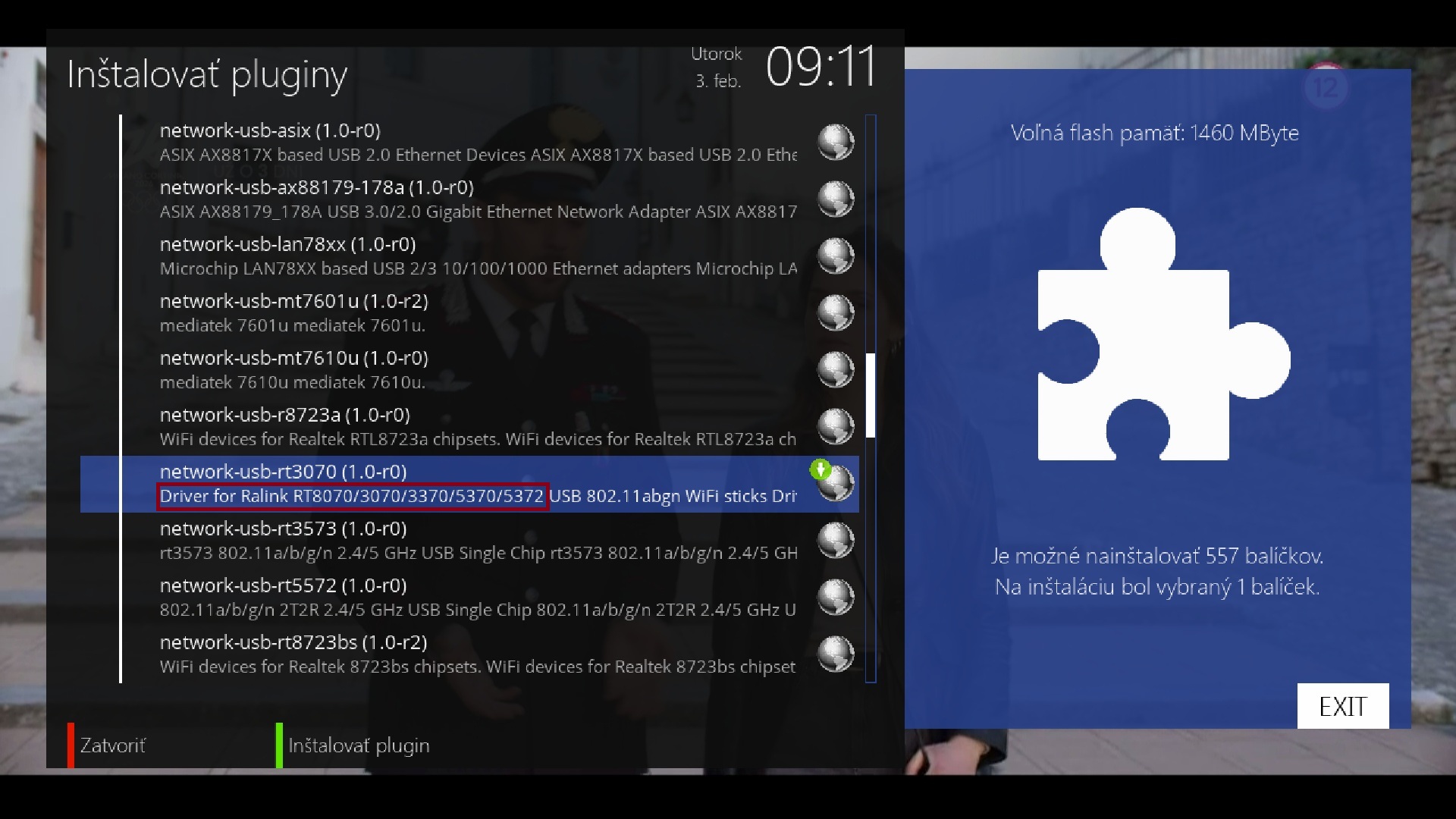 Pri WiFi USB adaptéroch s chipsetom RT5370 sa v Enigma2 používa driver RT3070, pretože podporuje viac príbuzných chipsetov. V zozname ho nájdete ako network-usb-rt3070 a postup inštalácie je rovnaký ako vyššie, líši sa len výber balíčka.