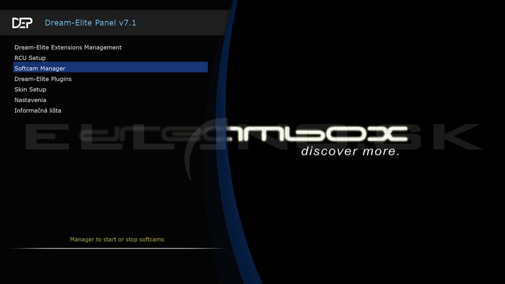 Pre spustenie softcam panelu v enigme Dream Elite stlačte modré tlačidlo na diaľkovom, tým sa Vám zobrazí Dream Elite panel (obr.naľavo nižšie). V Dream Elite paneli prejdite na položku Softcam Manager a potvrďte ju tlačidlom OK. Zobrazí sa Vám Softcam Manager v ktorom môžete prepínať, spúšťať a vypínať nainštalované softcamy.