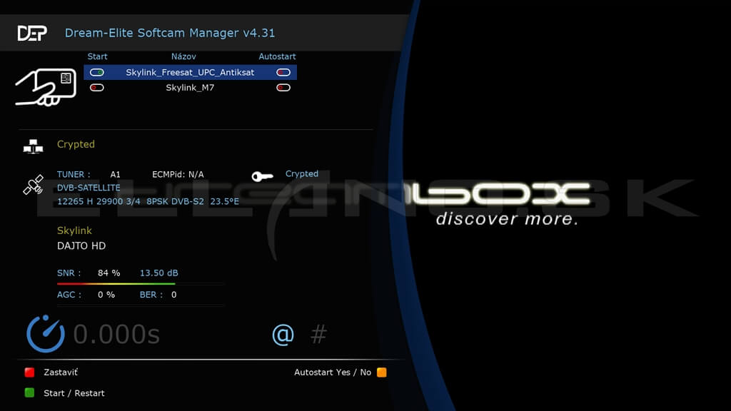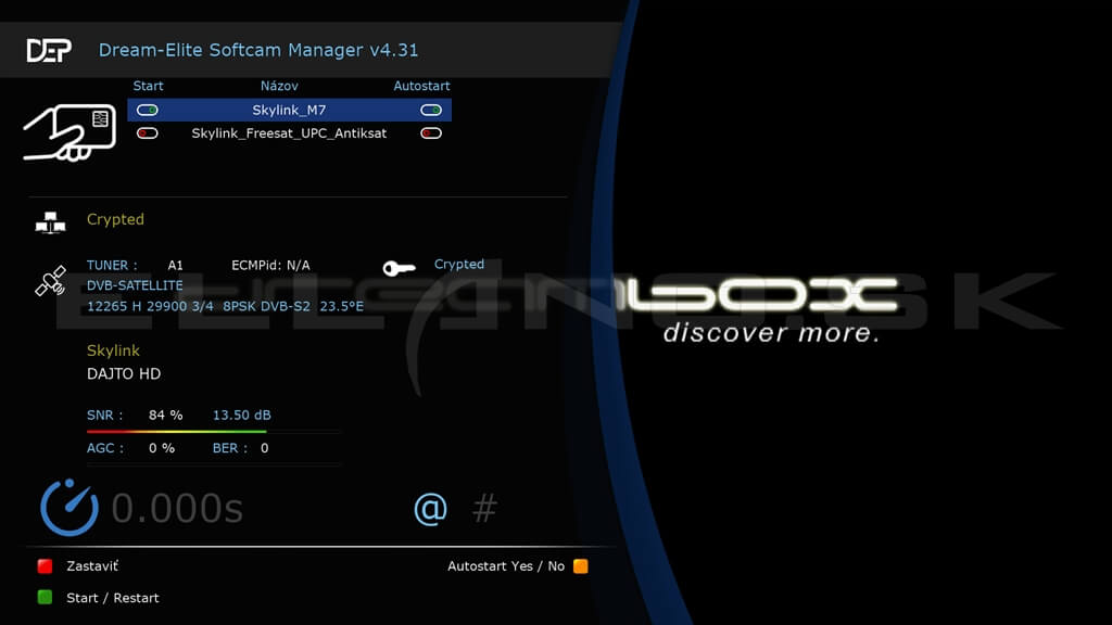 Pred spustením iného softcamu najskôr vypnite aktívny softcam (aktívny softcam má prepínač start zobrazené nazeleno) a to tak že nadídete naň (v našom príklade je aktívny softcam Skylink M7) a stlačíte červené tlačidlo na diaľkovom.