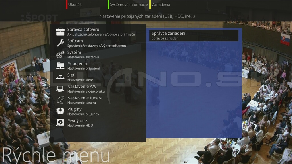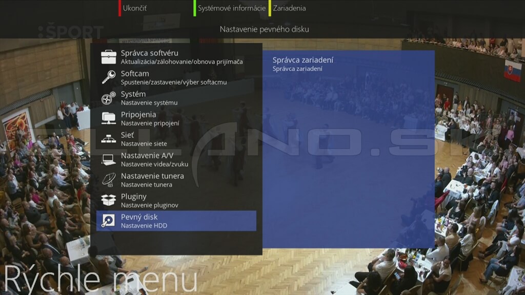 Po zapnutí prijímača a spustení systému, stlačte modré tlačidlo na diaľkovom ovládači pre zobrazenie Rýchleho menu. Prejdite nadol na položku Pevný disk a potom na položku Správca zariadení.