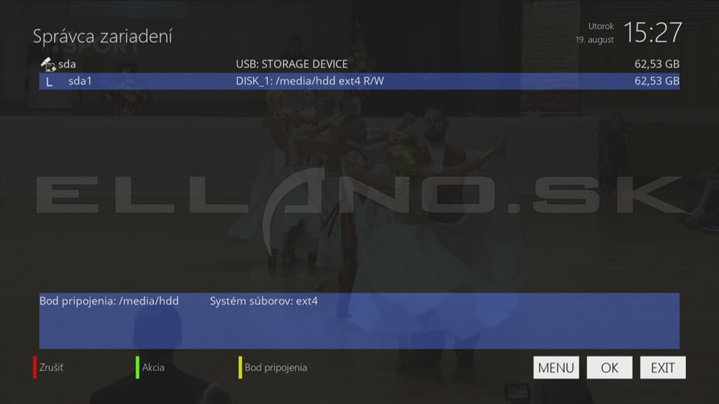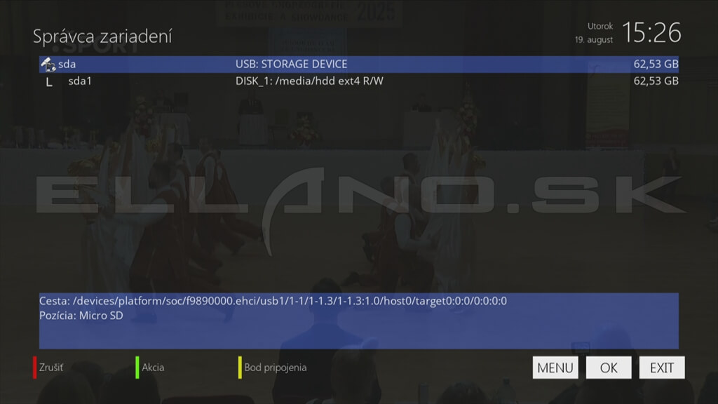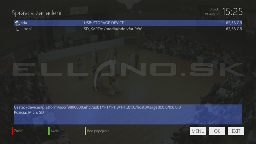 V menu Správca zariadení vám systém zobrazí údaje o vloženej microSD karte (v našom prípade má karta kapacitu = 62,53GB (64GB), formát karty = vfat a prípojný bod/mount = media/hdd).