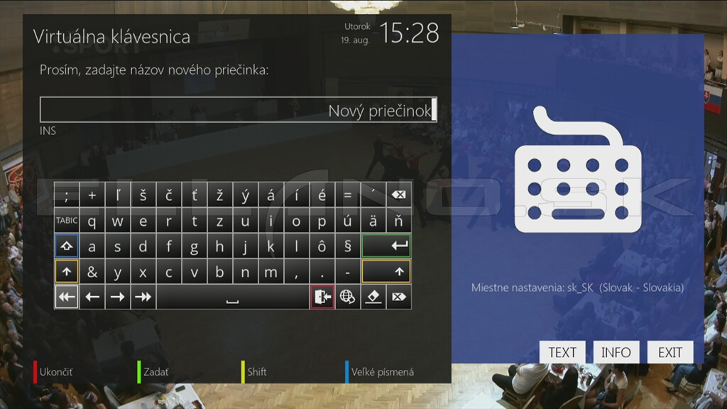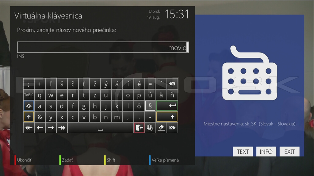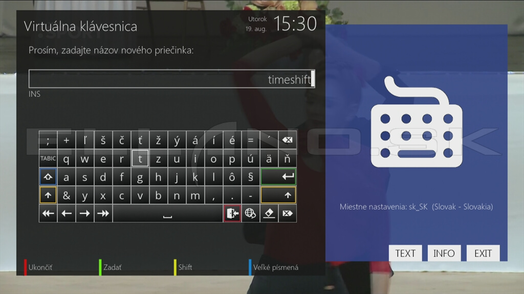 Otvorí sa vám okno s virtuálnou klávesnicou, v ktorom vymažete (tlačidlom Backspace v pravom hornom rohu klávesnice) predvolený názov Nový priečinok a následne vpíšete názov timeshift. Potom už len uložíte zeleným tlačidlom alebo zelenou farbou orámovanú klávesu Enter na virtuálnej klávesnici.