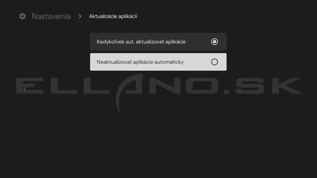 V časti Nastavenia / Aktualizácie aplikácií môžete zapnúť alebo vypnúť automatické aktualizácie. Ak chcete mať systém pod kontrolou a vyhnúť sa spomaleniu počas sledovania TV, odporúčame aktualizovať manuálne.