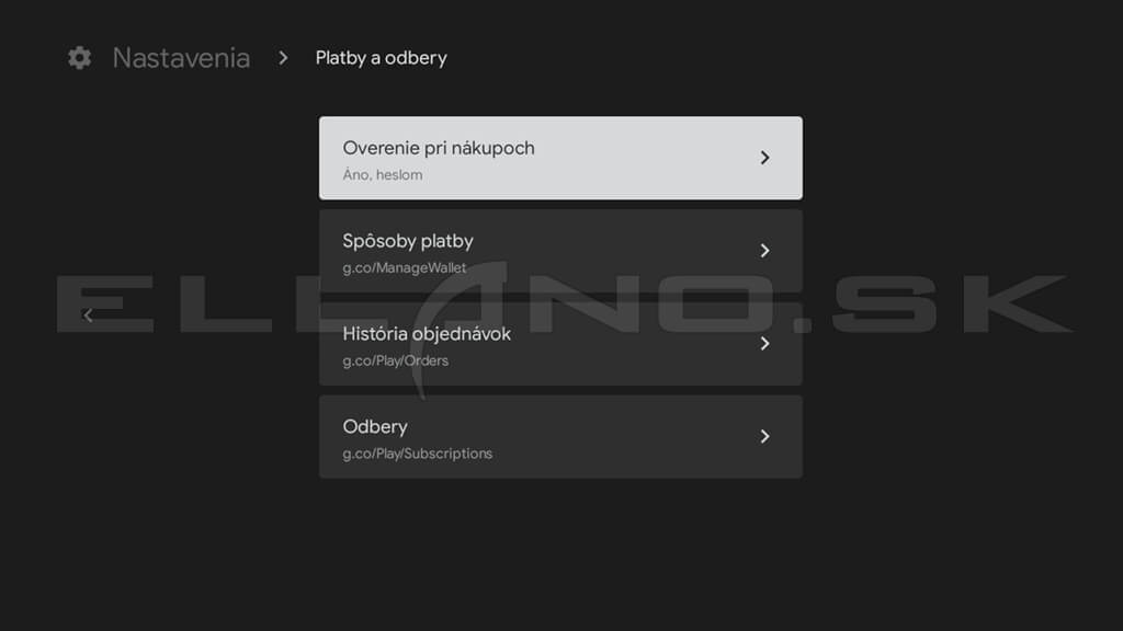 Sekcia Platby a odbery slúži na správu platených aplikácií a predplatných. Aj keď používate iba bezplatné aplikácie, určite si nastavte aspoň Overenie pri nákupoch chránené heslom.