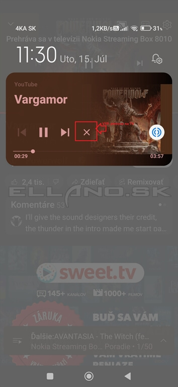 Prehrávanie ukončíte priamo v smartfóne otvorením lišty upozornení a kliknutím na ikonu X pri aktívnom prenose videa z aplikácie YouTube. Tým sa prenos na TV okamžite zastaví.