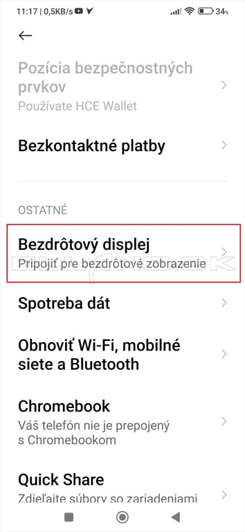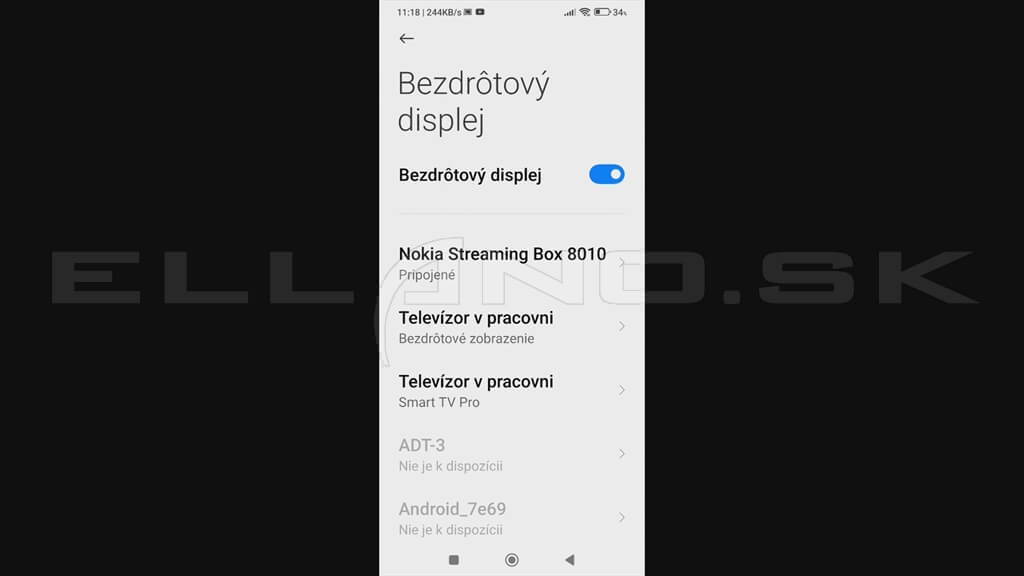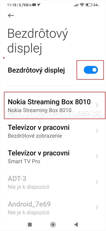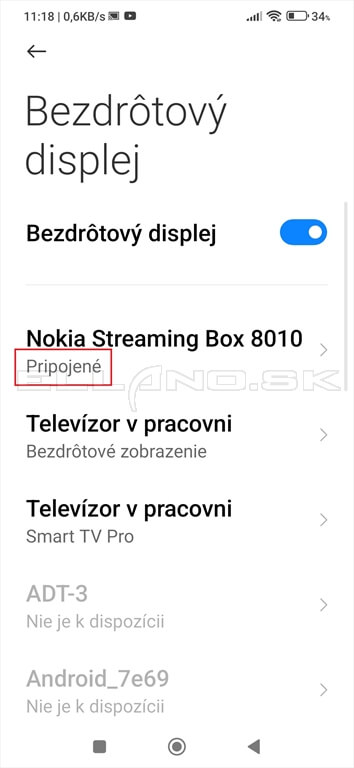 V nasledujúcom menu zvoľte položku Bezdrôtový displej a zapnite ju pomocou prepínača. Smartfón automaticky vyhľadá dostupné zariadenia v sieti. Zo zoznamu vyberte svoje multimediálne centrum (napríklad Nokia Streaming Box 8010) a po úspešnom pripojení sa zobrazí stav Pripojené. Následne sa obraz zo smartfónu zobrazí na obrazovke TV.