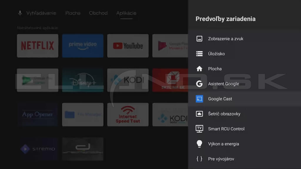 Aplikáciu Chromecast / Google Cast nenájdete medzi aplikáciami ako samostatnú ikonu. Podporu tejto funkcie zistíte priamo v nastaveniach systému Android TV alebo Google TV.