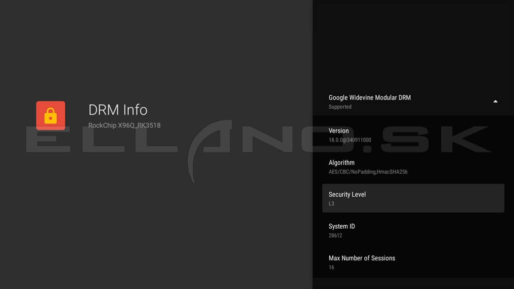 X96Q používa Widevine DRM v úrovni L3, čo je najnižšia softvérová ochrana. Umožňuje základné prehrávanie chráneného obsahu, ale nestačí na aplikácie vyžadujúce DRM L1. V praxi to znamená obmedzenú kvalitu streamovania alebo úplnú nefunkčnosť služieb, ktoré potrebujú hardvérovú ochranu (napr. Skylink Live alebo niektoré prémiové aplikácie).